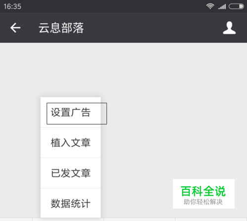 首先要进入“云息部落”公众号,窗口底部有三个菜单,点开“广告植入”,再点击“设置广告”