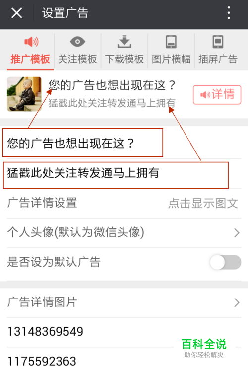 点击“+”添加广告模板:推广模板,关注模板,下载模板,图片横幅和插屏广告,任选一个添加即可。如选“推广模板或关注模板或下载模板”,则可以进行文字编缉,“广告详情设置”包括“图文“和”跳转链接”两种,选链接可以跳转到任意网址【或APP下载地址】。若选图文,则对图文的一些信息进行设置。设置完成为点“提交”。