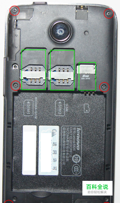1、拆除后盖,取下电池,拆下SIM卡及存储卡,用螺丝刀拆除红圈内的6颗螺丝