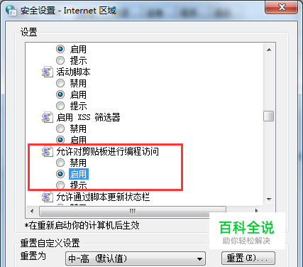 找到如图中的位置 把允许对剪贴板进行编程访问选项改为启用。 然后确定。