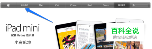 在电脑中的浏览器中打开苹果官网页面: http://www.apple.com/cn/ ,点击页面中的 “在线商店”链接,如图所示