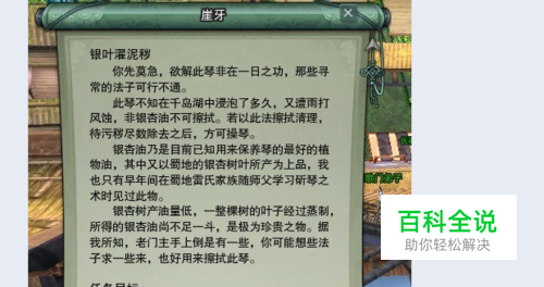 果断和崖牙对话,一番对话之后,会让大侠去拿【银杏油】(长歌门副本英雄书院的老3有一定几率掉落,看脸哦)擦琴;