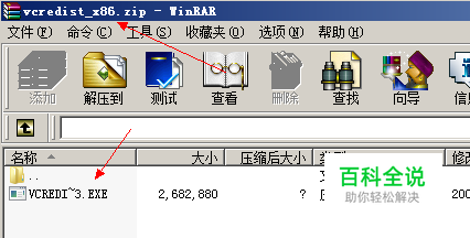 首先把 vcredist_x86.exe,改为 vcredist_x86.zip然后打开提取出“ VCREDI~3.exe" 注明:(我这演示用的WINRAR程序打开ZIP程序,用系统自带ZIP解压程序是一样的) 如图: