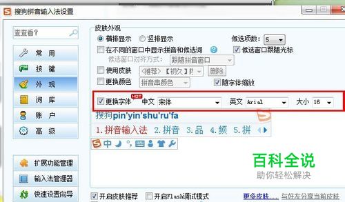 此时进入搜狗输入法设置窗口,有更换字体这一项,这这一项前面打上对勾。