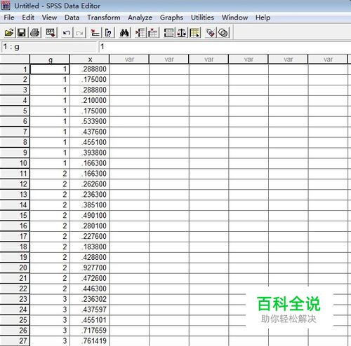 弹出窗口中,把变量数据(x)送入Dependent List ,把分组变量(g)送入 Factor List 。