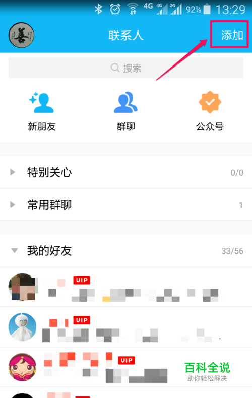 登录QQ并切换到联系人选项卡,点击右上角的“添加”功能。如图所示: