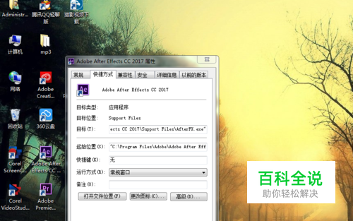 打开AE CC 的文件目录。选中AE图标右击选择“属性”,点击“快捷方式”选中“打开文件位置”