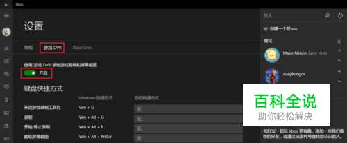 打开XBOX应用后,可以在应用的左侧工具条上看到经典设置齿轮图标,点开它,就会发现界面进入设置界面,点击“游戏DVR”标签,其下的“使用‘游戏DVR’录制游戏剪辑和屏幕截图”是默认开启的。
