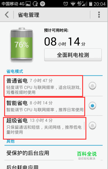 点击以后,进入到省电管理的页面,这里有三种省电模式,【普通省电】,【智能省电】和【超级省电】模式。