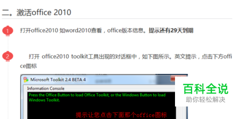 下载后解压并打开, 打开 office2010 toolkit工具出现的对话框中,如下图所示。英文提示,点击下方office图标