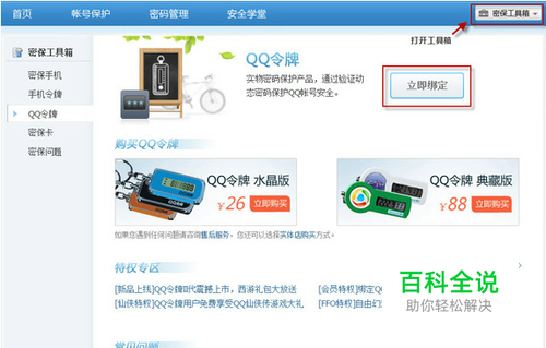 打开密保工具箱,进入QQ令牌设置页面 没有QQ令牌的用户需要先购买后绑定,如果已经拥有令牌的用户,可以直接点击“立即绑定”进入绑定流程。