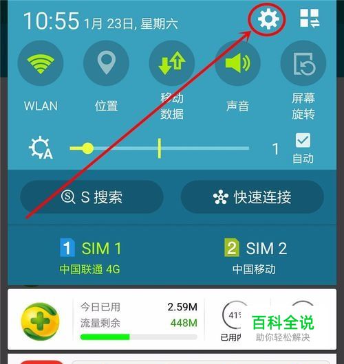 安卓操作系统,操作界面大同小异,滑动手机上端,展开的菜单里面,点击【设定】图标,如下图所示: