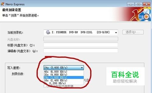 在“写入速度”那里点击一下,选择24X的速度,速度过快可能会刻坏碟片,建议24X的速度刻录。点击“刻录”。等到刻录完成就行了。