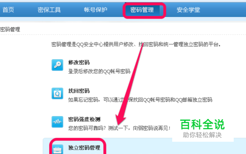 进入QQ的安全中之后,点击上方的导航 密码管理——》独立密码管理,如图。