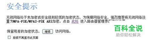 笔记本和手机上网总是提示无线网络处于未加密或安全级别较低的加密状态,强烈推荐将无线网络设置为WPA-PSK/WPA2-PSK AES的提示,如图