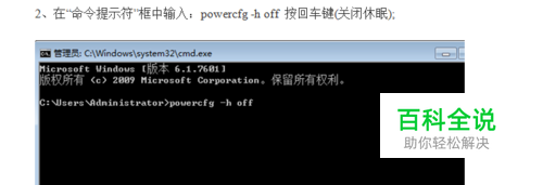 2、在“命令提示符”框中输入:powercfg -h off 按回车键(关闭休眠);