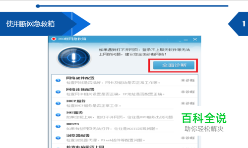 1.使用断网急救箱 如图,使用断网急救箱,然后点击全面诊断,诊断后进行修复,修复效果如下图所示。这时尝试域名解析错误错误代码105导致上网障碍是否解决。
