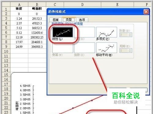 在选项卡中显然详细多了,注意选择X、Y对应的数据列。“常数为零”就是指明该模型是严格的正比例模型,本例确实是这样,因为在浓度为零时相应峰面积肯定为零。先前得出的回归方程虽然拟合程度相当高,但是在x=0时,仍然有对应的数值,这显然是一个可笑的结论。所以我们选择“常数为零”。