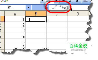如图我们要将A列数值转化成文本,在B1输入=" "&A1下拉,这里要注意的是:双引号之间要加一个空格哦。