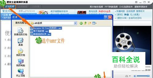 运行添加视频文件。打开狸(liwo)窝全能转换器后,单击界面左上角的第一个按钮“添加视频”,浏览打开文件夹并将amr音乐文件导入到软件。有的用户可以会疏忽的,就是在打开文件夹时没发现有amr文件,其实有可能忘掉选择文件类型了,选择All Files(*.*),即所有文件,就可以看到了。