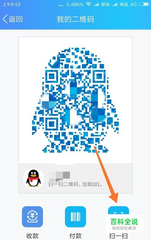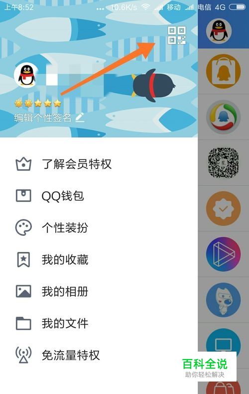 然后,将手机上的QQ图标点开登录后,点自己QQ的头像,然后手机屏就显示下图所示界面,然后,再点屏幕右上角的二维码小图标。