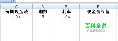 一、录入数据。FV的计算需要三个变量,分别是每期现金流(即年金数额)、期数(可为日、月、季、年)、利率(可为日、月、季、年)。如图所示,年金数额为100,期数为5,利率为10%。