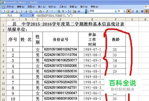 用现在的年份(如2016)减去E4就可以直接得到结果如下图,与最初表格"教龄"一列对比结果完全一致。