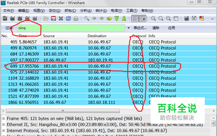 输入oicq进行筛选(oicq就是QQ的意思) 可以看出源地址是183.60.19.41;目标地址是10.66.49.67。