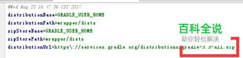在网上搜索了一下,发现问题出在gradle-wrapper.properties上,出现这个问题的项目都是应为使用了gradle-3.3-all.zip,而studio 无法直接下载gradle-3.3-all.zip导致; 打开android studio项目,看红色区域标识,我们要解决的问题焦点: