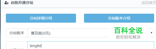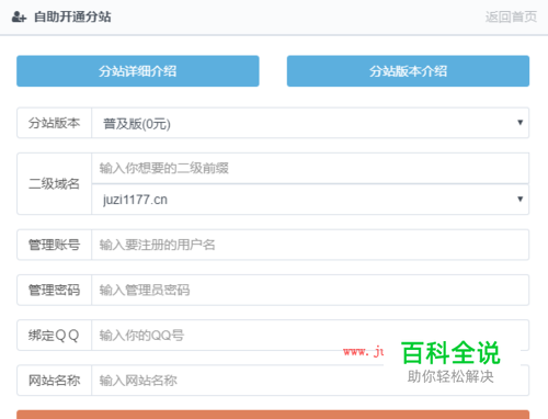 2、二级域名怎么填? 二级域名由二级前缀和后缀组成,我现在教大家怎么填二级前缀,其实很简单,二级前缀可以使用你的网站名称的全拼。举个例子,如果你的网站名称叫:桔子分站,那么二级前缀就填juzi即可;不要太长,一般2-8个字母即可;任选一个你自己喜欢的即可,如下图所示: