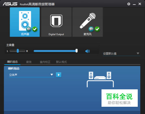 打开声音管理器,可以看到扬声器有四个选项:喇叭组态、音效、室内矫正、默认格式
