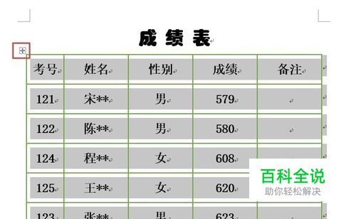 鼠标光标放在表格上,左上角会显示表格控制柄,单击表格左上角的控制柄,选中该表格。