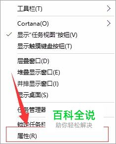 在系统桌面状态下,可使用鼠标右击任务栏空白处,在弹出的菜单中选择“属性”选项,如图所示:
