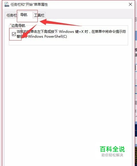 在导航选项卡中,勾选“当我右键单击左下角或按下windows键+X时,在菜单中将命名提示符替换为windows Powershell”;