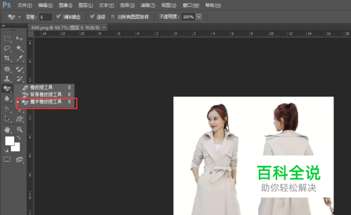 导入图片后,点击左边橡皮擦工具栏——魔术橡皮擦工具——选择好 鼠标移动到图片底色 点击白色部分——直接擦除背景色 呈现出是透明的 (图片需要解锁,右下边双击图层 解锁出来)