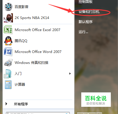 点击开始菜单之后,弹出窗口会显示很多选项,我们点击设备和打印机选项