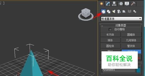 对对象应用“网格平滑”,在面板中选择“创建”—“几何体”—“标准基本体”—“四棱锥”工具,在视窗里创建一个四棱锥。