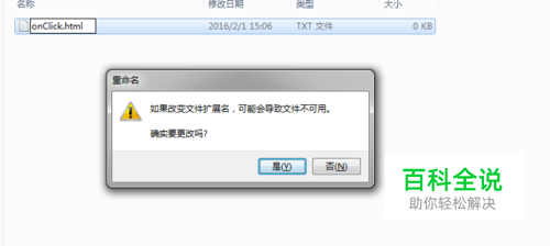 新建完记事本之后,重命名为onClick.html,点击回车按钮,弹出的窗口中选择确认修改文件后缀名。
