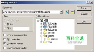 (图2)。 ② 在“Folders/drives”框中选中某个文件夹,再按下“Extract”按钮,就可以将压缩文件解压至其中。 提示:winzip 8.1会记录下压缩过的文件。想更快地对压缩文件实施解压,可以用鼠标右键单击系统任务栏上的Zip小图标,再在弹出菜单上进行选择。