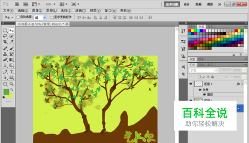 然后选择复位画笔,选择树叶工具,设置前景色为绿色,背景色为白色,然后点击预设画笔样式,勾选画笔的形状,勾选画笔的颜色动态,然后调整到合适的位置,开始绘制树叶,绘制好如图。