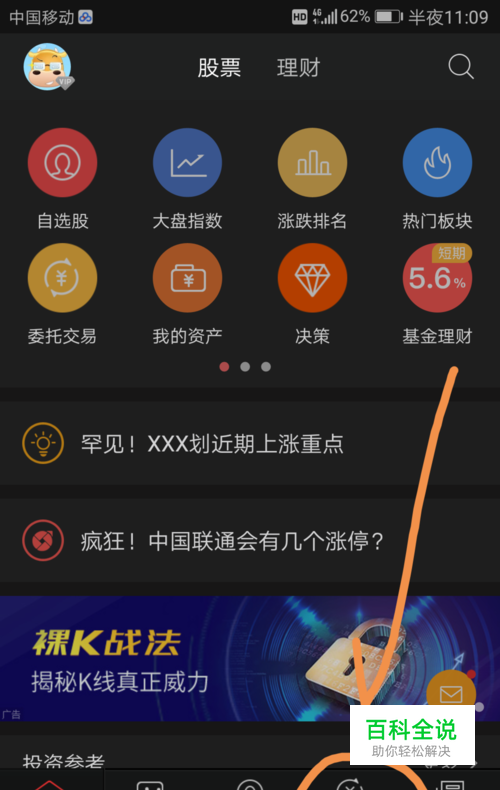 进入手机同花顺界面之后点按界面下方箭头指向的交易标志。