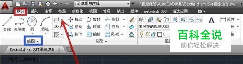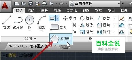 新建一个文档,点击“默认”选项卡(图中红框)中的“绘图”选项组(图中蓝框)中的“矩形”旁的下拉箭头(图中红色箭头所指)