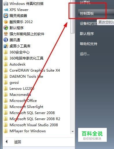 1、点击“开始”--“控制面板”,如图,你可以在如图右侧找到这个选项,单击左键打开。