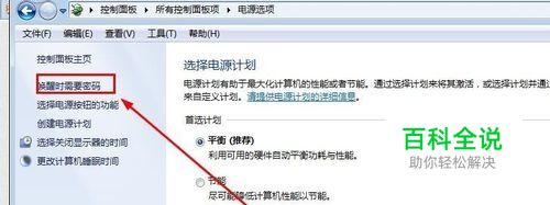 5、然后点击左侧“唤醒时需要密码“,在打开的对话框中选择,唤醒需要密码,如图选择。单击保存修改即可。