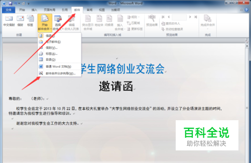 首先在【邮件】菜单下,找到【开始合并邮件】点击,在其子菜单找到【邮件合并分步向导】
