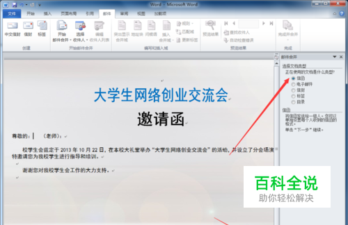 然后开始邮件合并,在【选择文档类型】中选择【信函】之后点击【下一步】