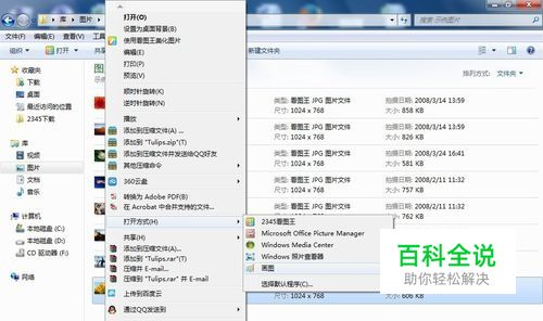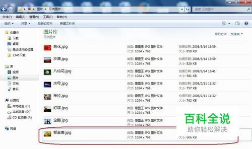 我们以系统自带的图片为例。 如下图,我们看到“郁金香”这张图片文件格式是“JPG”,大小是“1024x768”。