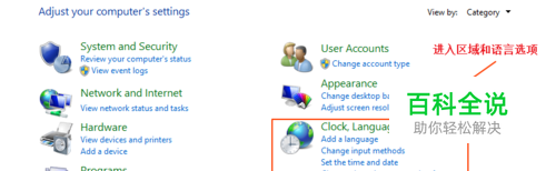 在 时钟,语言和区域界面,点击打开 区域 注:有的系统是 语言 和 区域 是在一起的,点击即可