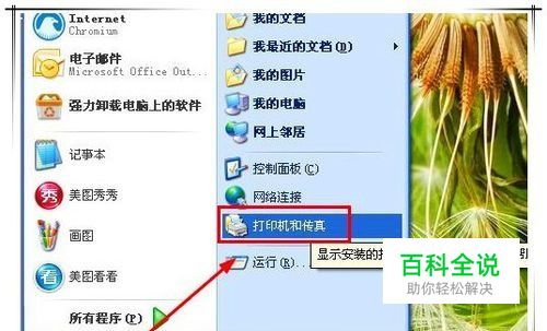 第一步,如果你的调整是想对电脑上全部文档生效,那么可以按以下步骤操作。依次点击“开始菜单”——“打印机和传真”。
