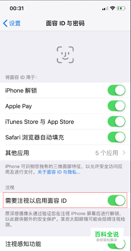 勾选这个功能后,手机摄像头感知你是否在注视手机,如果你看着屏幕,才会启用面容ID,这里刷脸才会解锁
